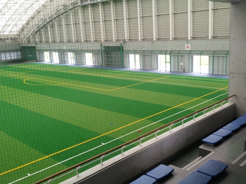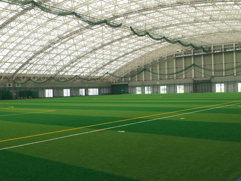 東予総合運動公園の屋内運動場「ビバ・スポルティアSAIJO」。人工芝が敷かれ、雨天時でも安心です。